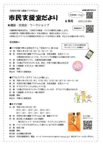 こんにちは。スタッフ尾石です。市民支援室だより 2022年6月号が発行されました。 〈トピックス〉●講座・交流会・ワークショップ・6月1日(水) ママ目線で考える防災カフェ「花あかり」・6月2日(木)、12日(日)、22日(水) ダブルケアラーズデイ 「きくよが聞…